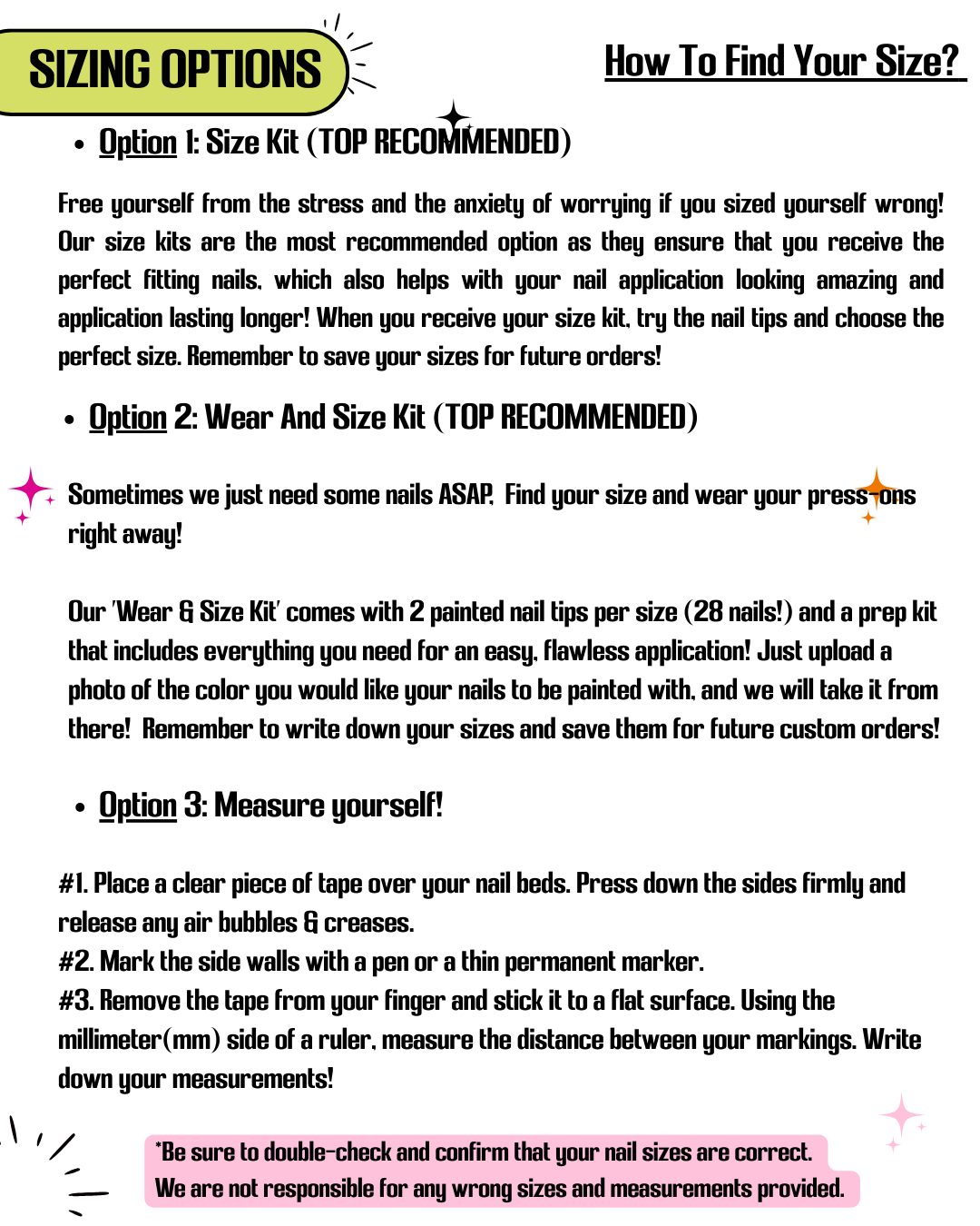Free yourself from the stress and the anxiety of worrying if you sized yourself wrong or correctly! Our sizing kits are extremely recommended as it ensures that you receive the perfect fitting nails which also helps with your nail application lasting longer!